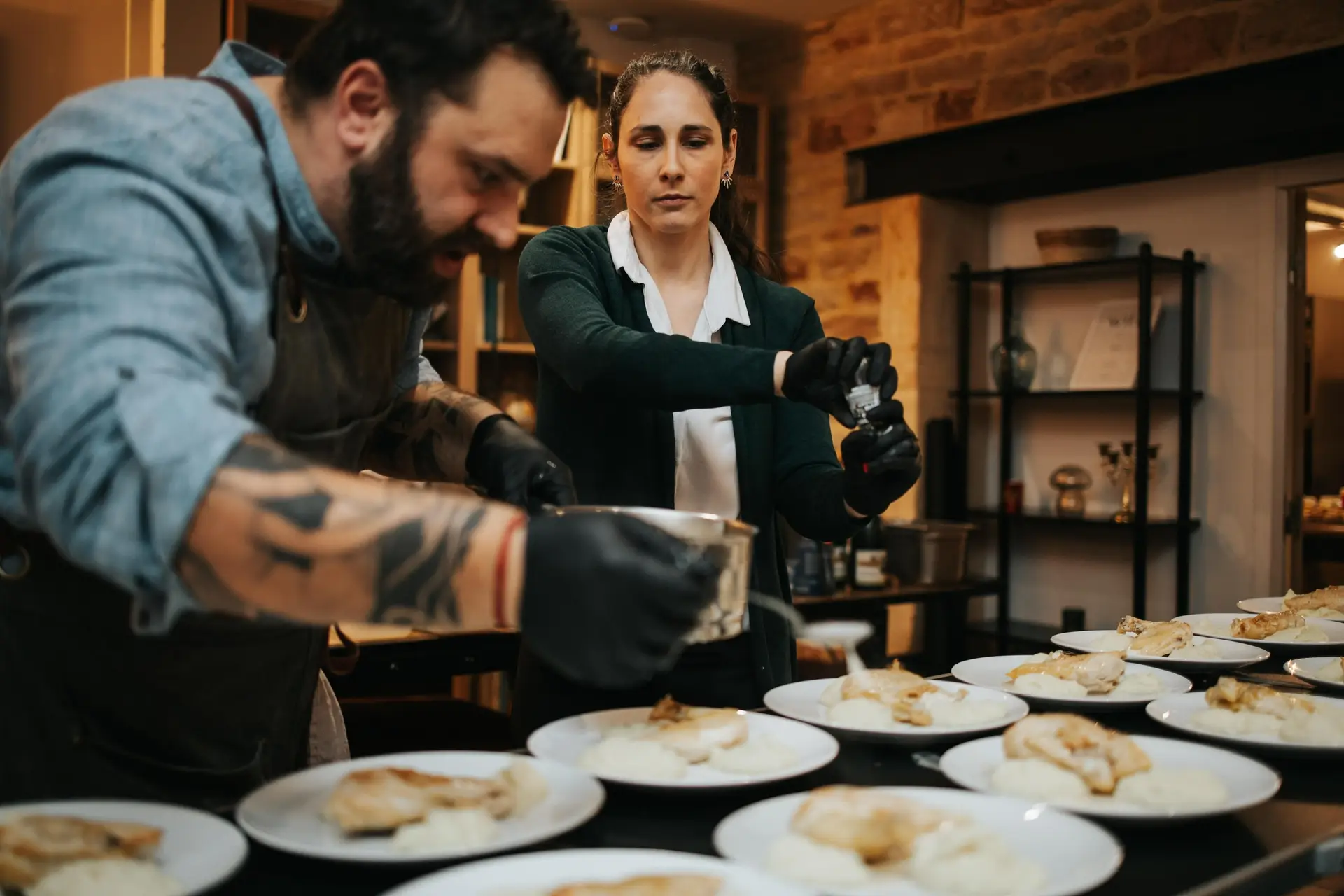 Le Chef Simon Lecomte prépare un repas à partir des produits du territoire et de son verger. Camille Lecomte, coordinatrice, veille à ce que tout s'articule.